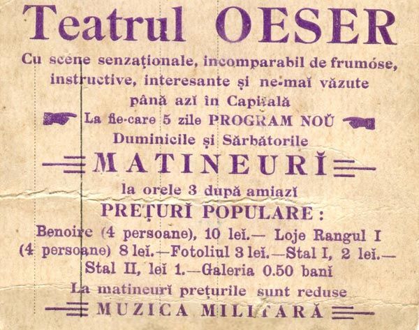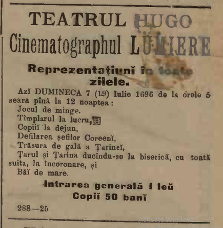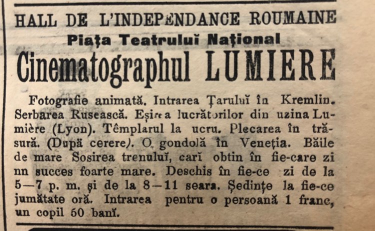 in timp cu toate ca, calitatea era foarte buna.In acest contest Cinematograful Fratilor Lumiere este lansat pe data de 28 decembrie 1895. Prima proiectie cinematografica, cu public platitor, are loc la Paris, pe Bulevardul Capucinilor la numărul 14, in Salonul Indian de la Grand Café. Filmul proiectat apartine fratlor Lumiere si este intitulat "La sortie des Usines Lumiere" Cinci luni mai tarziu pe data de 23 mai 1896 un articol din ziarul "L’Independance Roumaaine” anunta prima proiectie cinematografica din Romania, care va avea loc chiar la sediul susnumitului ziar. === "L’Independance Roumaine, 23 mai 1896" “Vedeti, voi, ce pretindeti ca va plictisiti. În foarte scurt timp Pamantul se va roti în jurul Bucurestiului, care va poseda un spectacol minunat, abracadabant, care va fi primul in top, noutatea noutatilor, întaiul între toate. Este cinematograful, acel faimos aparat de fotografie vie, care face tot Parisul sa alege la Grand Hotel. Bucurestiul va fi, timp de 45 minute, Paris. Publicul se va crede pe marile bulevarde, pentru ca va vedea defilând pe dinaintea lui viata febrila a Parisului, vehicule de toate felurile, pietoni, velocipete, monumente si magazine. În fine, el va fi transportat pe malul marii pentru a asista la o baie comuna. Aceasta noua inventie, datorata fratilor Lumiere, a minunat lumea stiintifica iar când aparatul a fost instalat la Grand Hotel era atât de multa lume încât trebuia tinuta in frau de gardieni. ...…Cu toata bunavointa mea de a mai povesti, am promis ca voi fi discret. Mai multe, în marele salon de la etajul întâi al zialului nostru, unde cinematograful va fi prezentat în curând.” Claymoor Prima demonstratie a avut loc pe data de 27 mai 1896, aceasta fiind prima proiecție cinematografică din România. Edwin Schurmann, impresarul Adelinei Pati și al Eleonorei Duse, a adus la Bucuresti o echipă a companiei Lumiere, cu operatorii Louis Janin, Charles Delattre, fratii Bonheur. S-au proiectat „vederi”, „fotografii vii”, „fotografie animată”, precum: „Un dineu”, „Lecția de biciclete”, „Grădina Botanică”, „Dejun pe iarbă”, „Piața Operei din Paris”, „Pe lac”, „Serbarea rusească”, „Intrarea țarului în Kremlin”, „Ieșirea lucrătorilor din uzina Lumière”, „Tâmplarul la lucru”, „Plecarea în trăsură”, „O gondolă în Veneția”, „La băi la mare”, „Un bufet” și „Sosirea unui tren în gara Ciotat”, proiecții care au avut un mare succes. Aceste prime demonstratii de cinematograf la Bucuresti au fost oferite gratuit trecatorilor, de multe ori indiferenti în vitrina ziarului „L’Indépendance Roumaine”. Publicatiile vremii au avut numai cuvinte de lauda. Astfel, pe 6 iunie 1896, Misu Vacarescu nota în ziarul „L’Independance Roumanie” ca pe 27 mai avusese loc o primă reprezentatie, la sediul ziarului de pe Calea Victoriei, a acestei „minuni a secolului”. Aceste prime proiecții au fost făcute la sediul ziarului L'Independance Roumaine, precum și la teatrul Hugo (Modern sau Edison) situat pe strada Karagheorghevici(astazi Str. Eugeniu Carada) colt cu Strada Bancei Nationale(astazi disparuta). Putin mai târziu, spre sfirsitul lunii mai 1896, aceleasi filme au fost proiectate in exterior, pe fatada casei Török din Piata Teatrului National. Printre reclame luminoase, se intercalau primele filme scurte ale fratilor Lumiere, dupa cum povesteste Constantin Beldie în cartea lui “Caleidoscopul unei jumatati de veac în Bucuresti”. În ziarul Universul din 6 iulie 1896 la rubrica Spectacole gasim urmatorul anunt: „In fiecare dimineata de la 10-12 si dupa amniaza de la 4-10 la Teatrul Hugo se tin sedinte cu "Cinematograful" d-lor Auguste si Louise Lumiere din Lyon. Intrarea 1 leu.” Erau opt ore de proiectii zilnice de filme cu durata de un minut. Aceste anunturi, pentru reclama filmelor de la Teatrul Hugo, se repeta în ziarul Universul pe perioada intregii veri, ca mai apoi la sfarsitul lunii august, proiectiile sa fie reluate în sala „L’Indépendance Roumaine”, cu program zilnic de seara de la ora 8 la 11. Intrarea era 1 leu/persoana si 50 bani/copil." Prima pelicula documentara filmata în Romania a fost parada regala din 10 mai 1897, in care poate fi văzut și regele Carol I în fruntea paradei. Pe data de 25 iunie 1897, era proiectat primul film realizat local, „Vederi romanesti”, filmat de catre operatorul de origine franceză Paul Menu. Initial proiesciile cinematografice au avut loc in salile de teatru ale vremii precum Eforie sau Hugo. Daca starea timpului permitea priectiile se tineau in aer liber in gradinile de vara ale Bucurestiului. Primii intreprinzatori din domeniul filmului, mentionati in documente, sunt: Domnul Oser, “demonstratorul” Kuperman si “distinsul electrician A.C.Bottez”. În 1902, sala Circului Sidoli a fost închiriata de Compania Cinematografului Oser si va deveni o sala unde se vor proiecta filme. În anul 1905, gasim mentionat într-un program primul cinematograf permanent din Bucuresti: este vorba de Cinematograful Oser, care se afla mai sus de sala Teatrului Eforie pe Bld.Elisabeta. Aici rulau “filme picante, destinate numai pentru domni si doamne”. Aceeasi companie cinematografica o gasim prezentând filme si în sala Cinema Edison, pe str. Doamnei colt cu str.Academiei, pe locul unde mai târziu va fi Gradina Blanduziei. La concurenta cu Cinema Oeser era cu Casa Pathe Freres cu sediul pe Calea Victoriei, sub numele de "Cinema Pathe Freres". Casa Pathe Freres avea doua sali: pe str.Lipscani - Cinema Pathe Palace (numit dupa Charles Pathe, propietarul francez de difuzare a filmelor) si sala din Palatul Eforie, de pe Bld.Elisabeta. (Pathe-Palace aflat pe str Lipscani 37, in aceiasi cladire unde se va afla dupa niste ani Cinema Zaharia) Cele mai importante hoteluri ale vremii aveau sali unde se proiectau filmele "Cinema Oeser" si "Casa Pathe Freres": Hotel France, Hotel Bule